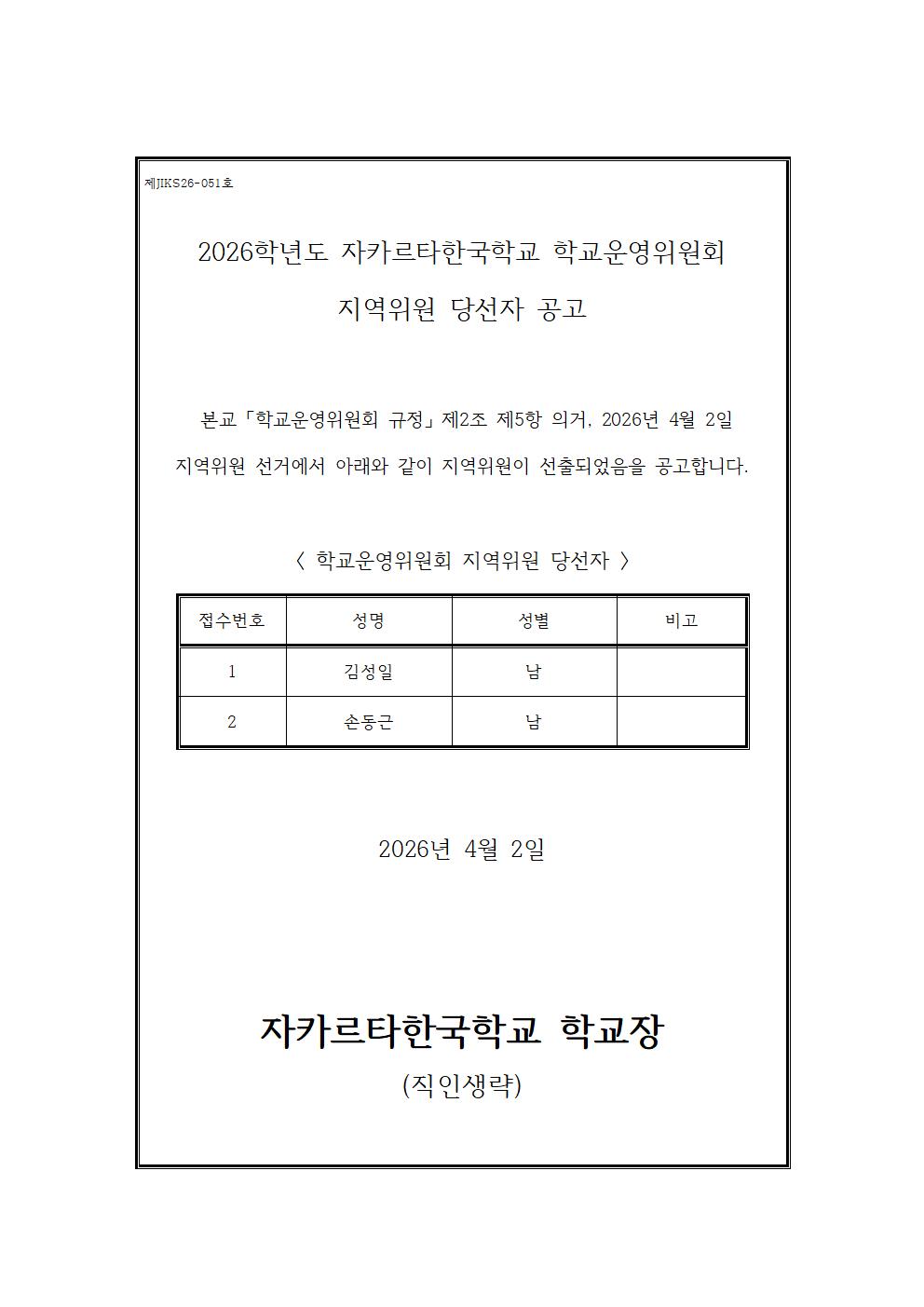 2026학년도 학교운영위원회 지역위원 당선자 공고