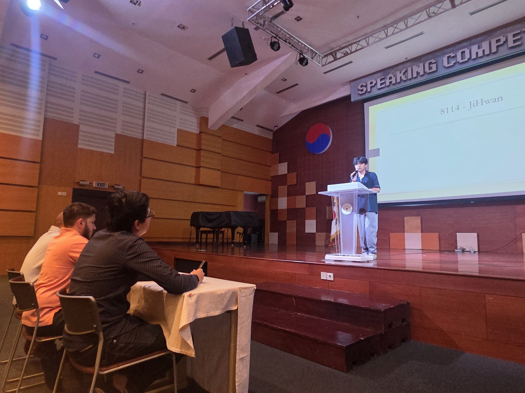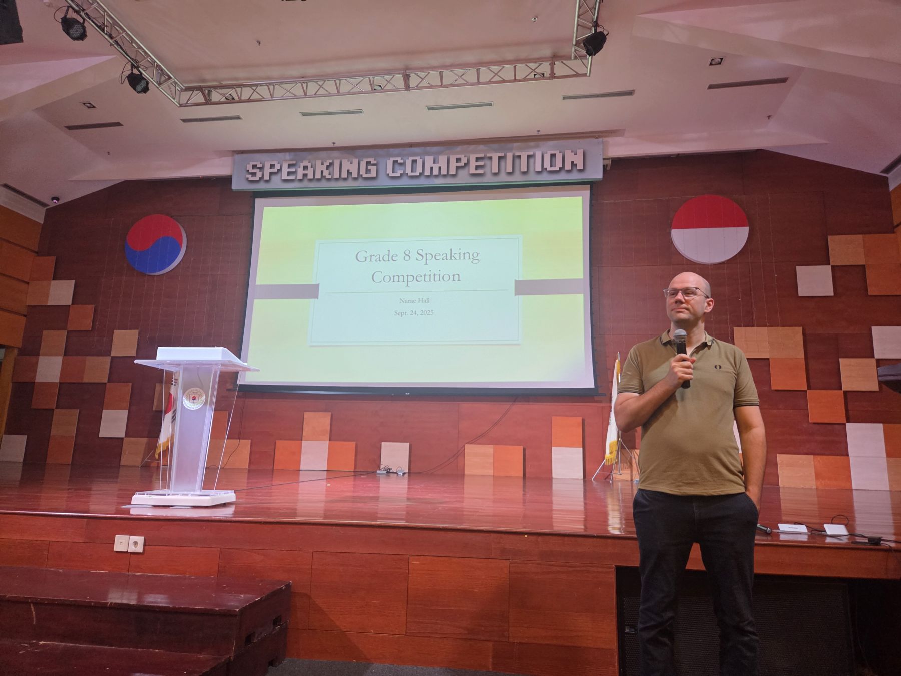 In 2025, during the Middle School Speaking Competition, we enjoyed many impressive speeches. Grade 7 students spoke on the theme, “If you could change one thing about school to make it better for students, what would it be and why?” Grade 8 participants tackled the question, “If you could spend one day in the future or past, which day would it be and why?” while Grade 9 explored, “How can we ethically use AI to improve efficiency?” The preliminary round took place online, where students submitted video speeches. From there, the top entries were carefully selected to perform live in Narae Hall, where they once again delivered outstanding presentations. Every participant stood out, showing both creativity and thoughtful perspectives.