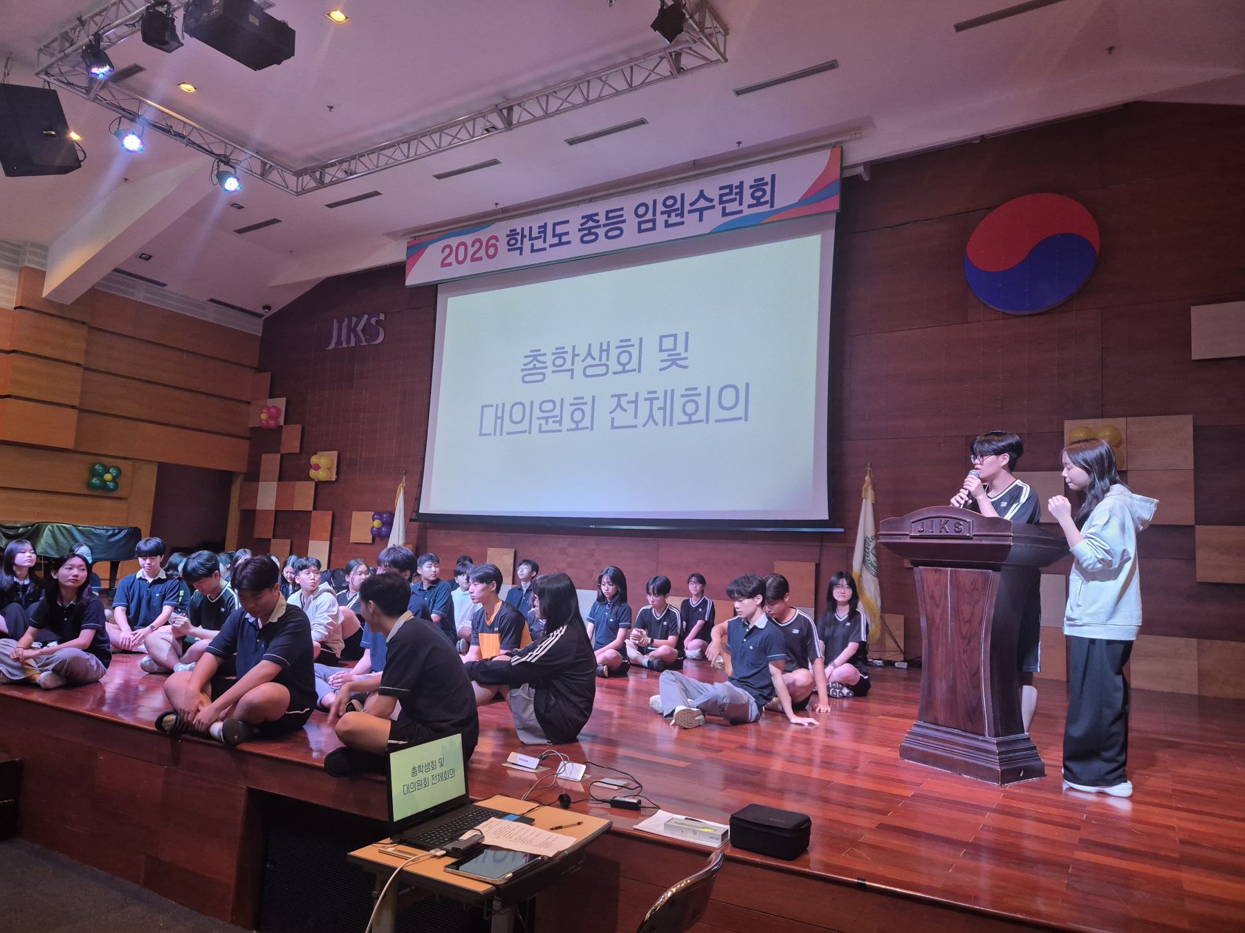 2026학년도 1학기 임원수련회가 3월 27일(금)에 총학생회 임원과 새로 구성된 1학기 대의원회(각 학급 회장, 부회장) 임원들을 대상으로 진행되었습니다. 임원수련회 1부는 새로 부임하신 이문성 교장선생님의 리더십강의를 시작으로 총학생회, 대의원회 전체회의 및 부서조직, 원 팀(One Team) 빌딩 프로그램, 공동체의식 함양 및 협력 강화 프로그램, 공동체의식 함양 및 협력 강화 프로그램 등 다양한 프로그램을 통해 리더로서의 마음가짐을 다지고 열정적으로 활동하고 앞장서서 봉사하는 학생회가 될것을 다짐했습니다.