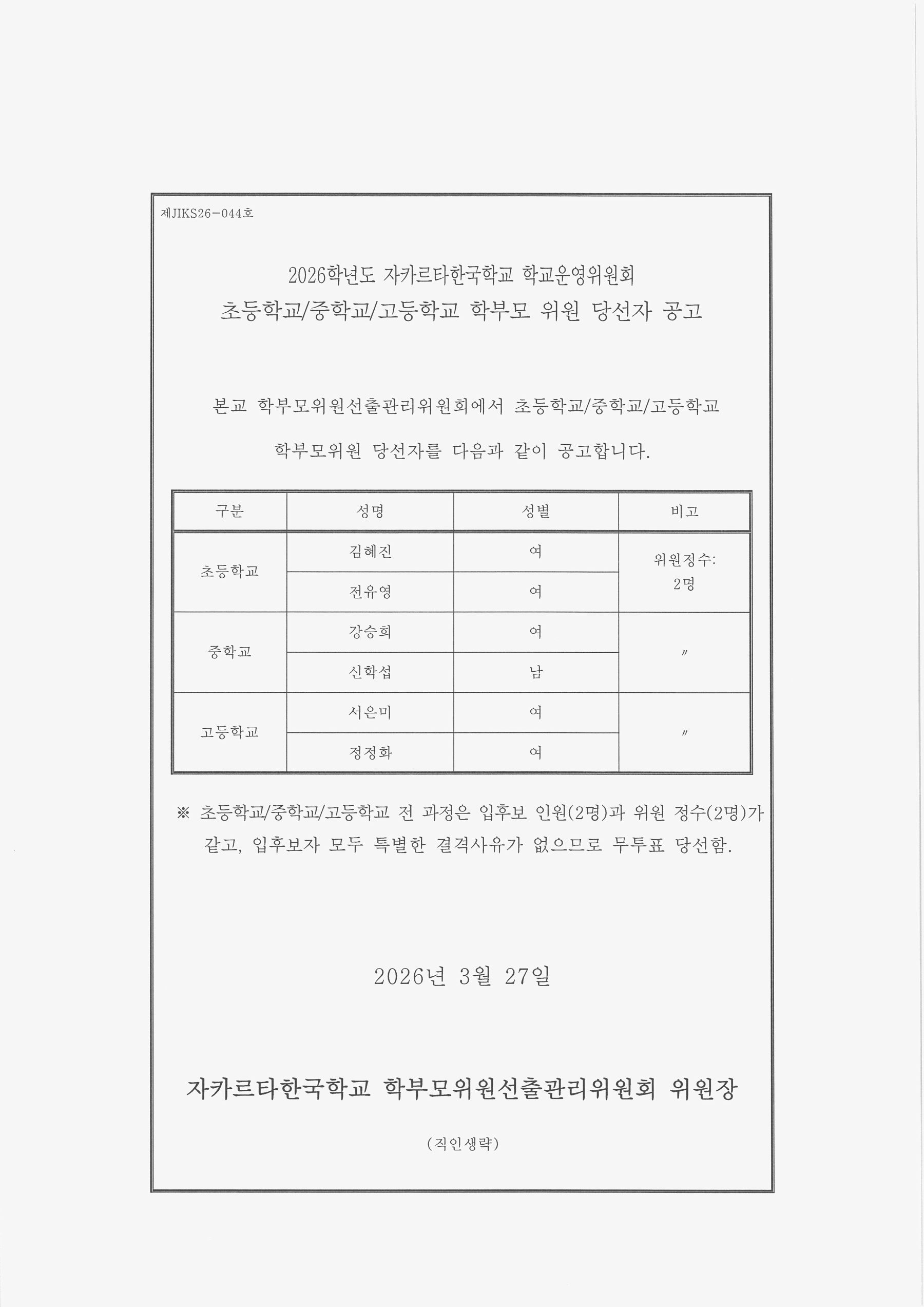 2026학년도 학교운영위원회 학부모 위원 당선자 공고