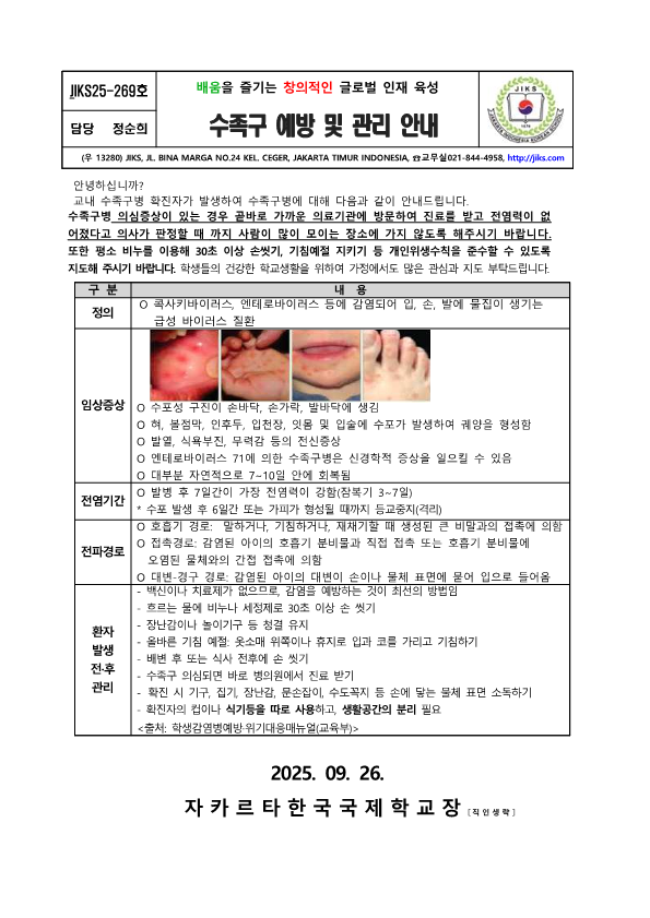 수족구 감염 예방 및 관리 안내 가정통신문