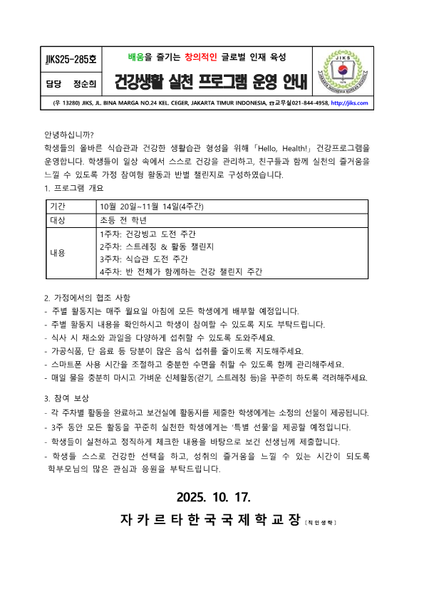 2026학년도 JIKS 초등과정 신입생 모집 공고