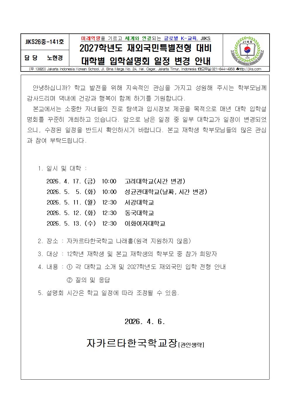2027학년도 재외국민특별전형 대비 대학별 입학설명회 일정 변경 안내