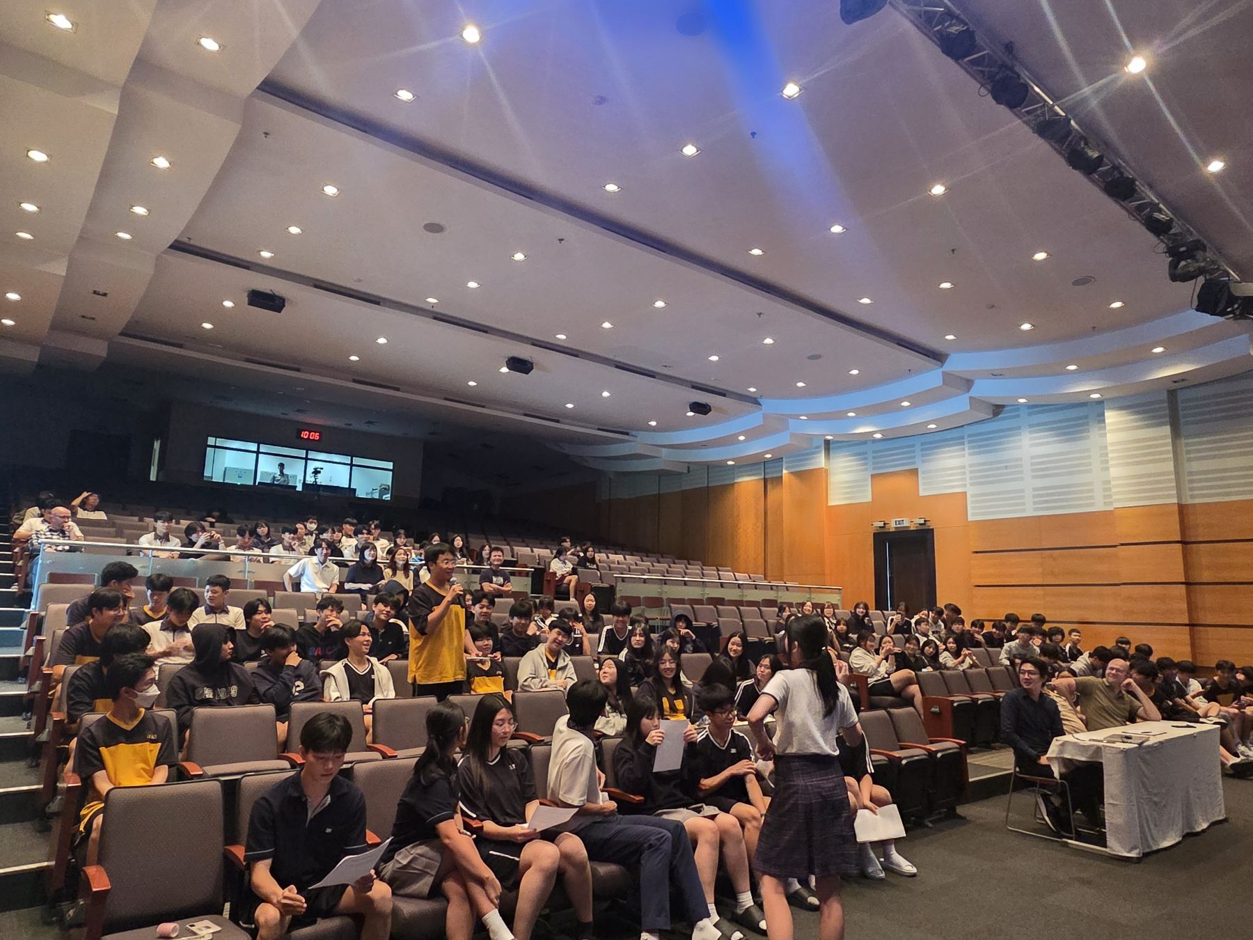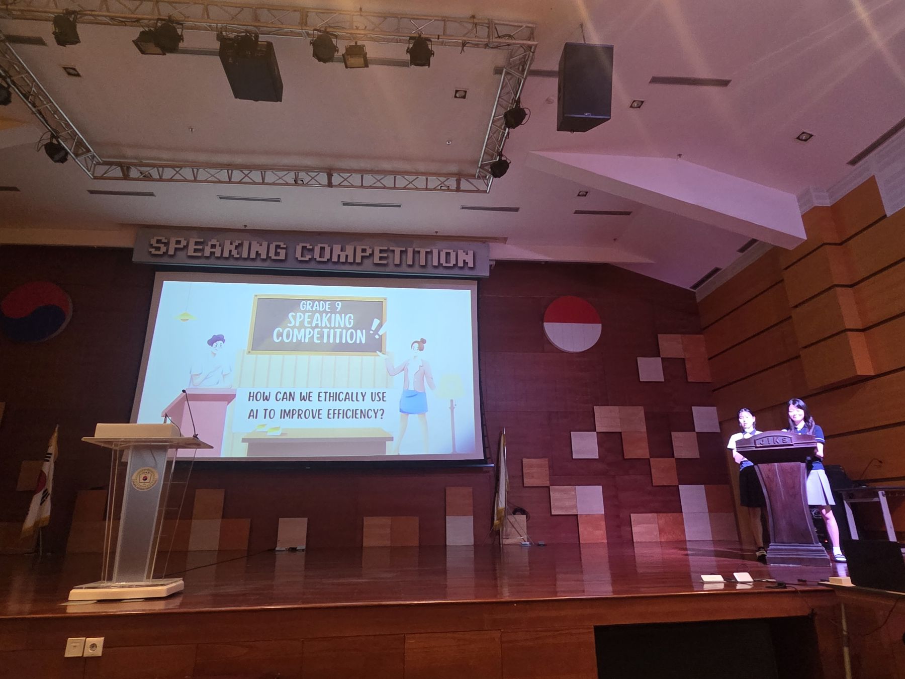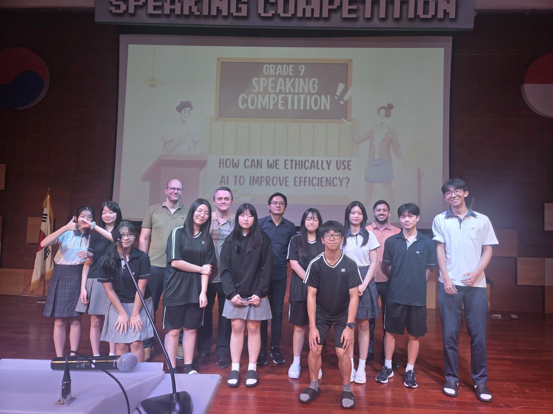 In 2025, during the Middle School Speaking Competition, we enjoyed many impressive speeches. Grade 7 students spoke on the theme, “If you could change one thing about school to make it better for students, what would it be and why?” Grade 8 participants tackled the question, “If you could spend one day in the future or past, which day would it be and why?” while Grade 9 explored, “How can we ethically use AI to improve efficiency?” The preliminary round took place online, where students submitted video speeches. From there, the top entries were carefully selected to perform live in Narae Hall, where they once again delivered outstanding presentations. Every participant stood out, showing both creativity and thoughtful perspectives.